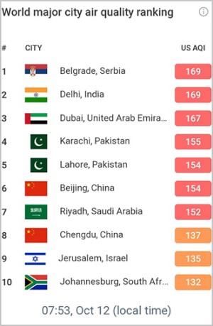 Prema podacima IQAir Earth o zagađenosti vazduha u glavnim gradovima, iza Beograda i Delhija, treći na svetu po zagađenosti vazduha je Dubai sa indeksom 167.