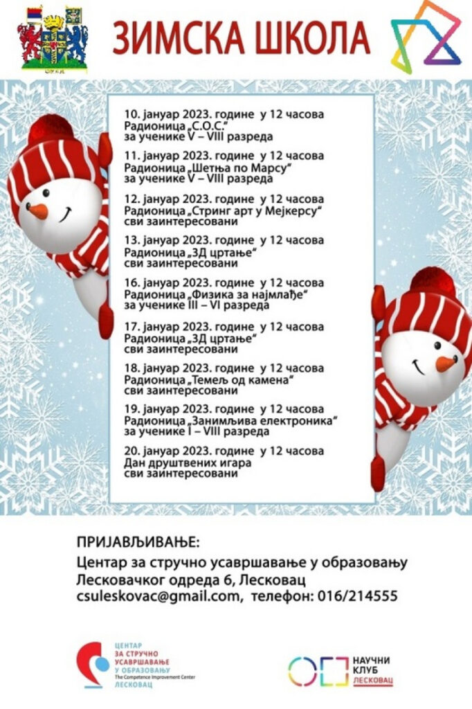Centar za stručno usavršavanje u obrazovanju – Zimska škola – od 10. januara, radnim danima u 12 časova radionice iz oblasti astronomije, geologije, fizike, elektronike, kao i radionica „3D crtanje“ i Dan društvenih igara.