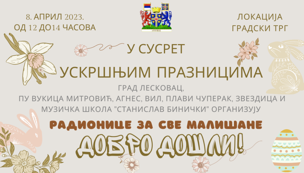U subotu, 8.4.2023. godine, na veliki dečji praznik u narodu poznatiji kao Vrbica, sa početkom od 12 časova sve do 14 časova Grad Leskovac će, na gradskom trgu, organizovati uskršnje radionice za svu decu sa teritorije grada Leskovca uz podršku Predškolske ustanove „Vukica Mitrović“ i vrtića Agnes, Vil, Plavi čuperak, Zvezdica i Muzičke škole Stanislav Binički.