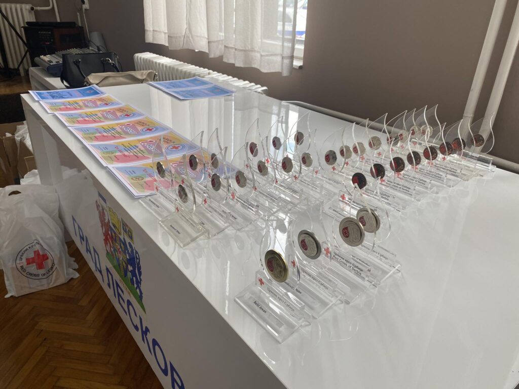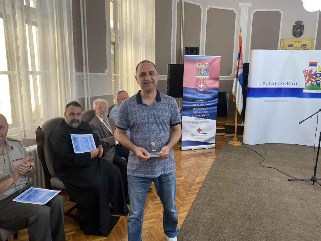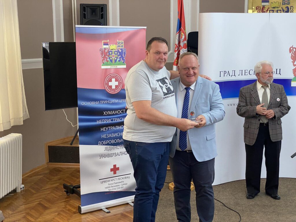 Leskovački Crveni krst u Svećanoj sali grada Leskovca uručio je danas zahvalnice i priznanja dobrovoljnim davaocima krvi koji su dali krv 35, 50, 75 ili 100 puta, kao i pojedincima, institucijama i udruženjima koji aktivno učestvuju u promovisanju i sprovođenju akcija dobrovoljnog davanja krvi. Među dobitnicima prizanja su i učenici koji su nagrađeni na likovno-literarnom konkursu „Кrv život znači“.