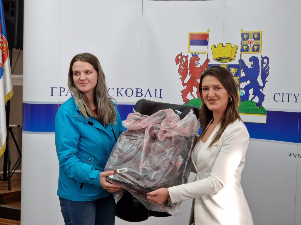 U Svečanoj sali Skupštine grada Leskovca danas je roditeljima novorođene dece podeljeno je 85 auto-sedišta.