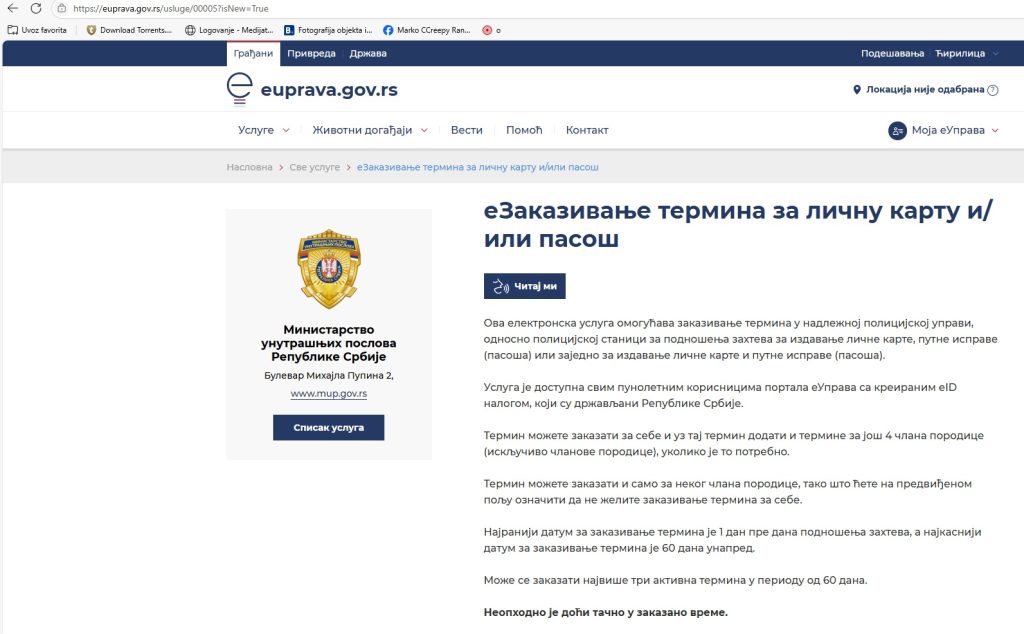 Ministarstvo unutrašnjih poslova obaveštava da je 9. maja 2025. godine, u saradnji sa Kancelarijom za informacione tehnologije i elektronsku upravu Vlade Republike Srbije, puštena u rad unapređena usluga Ministarstva unutrašnjih poslova eZakazivanje na Portalu eUprava, koja se odnosi na zakazivanje termina za podnošenje zahteva za izdavanje lične karte i putne isprave (pasoša).