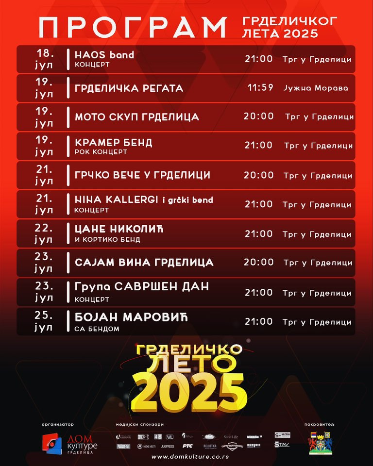 Većina događaja održaće se na trgu u ovom mestu. Manifestaciju, koja će trajati do 25. jula, organizuje Dom kulture Grdelica.